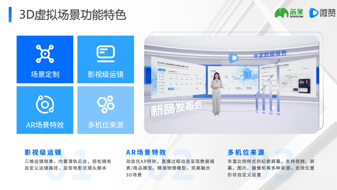 动态展现产物拆解细节或数据报表,场景可叠加 AR 特效,且能多平台同步推流,确保抽象天然写实。